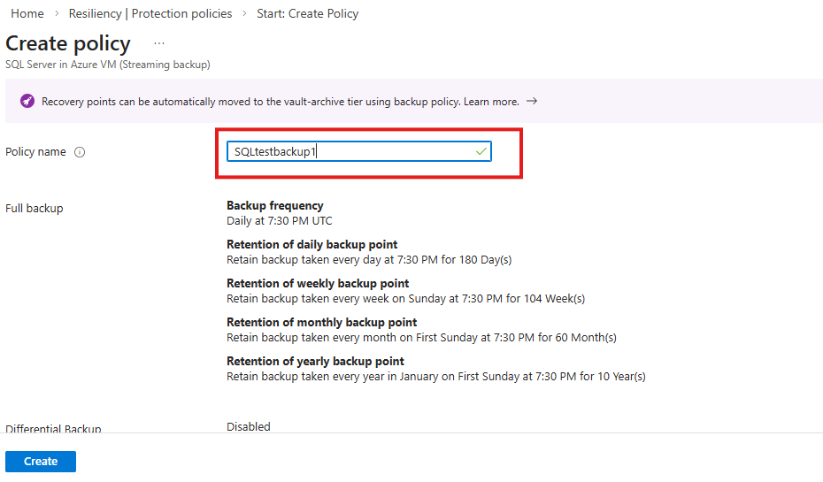 Go to Resiliency, and then select Manage > Protection policies > + Create policy > Create backup policy.