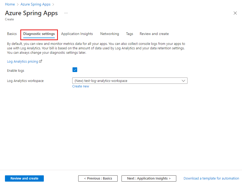 In the wizard for creating an Azure Spring Apps service instance, you can configure the Log Analytics workspace field with an existing workspace or create one.