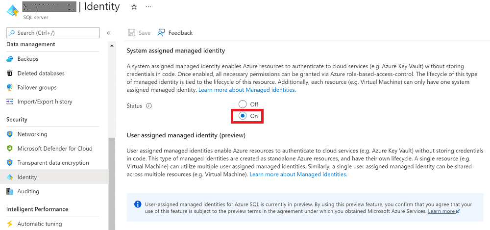 Go to your Azure SQL logical server, select Identity, and then set System assigned managed identity to On.