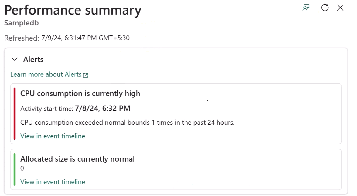 Du kan få flere oplysninger under Dashboard til ydeevne for SQL-database i Microsoft Fabric.