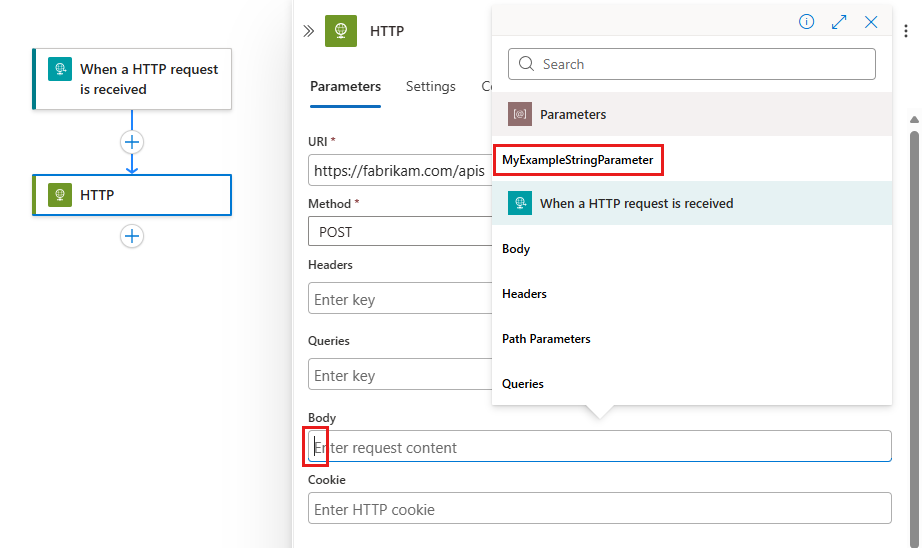 Führen Sie die folgenden Schritte aus, um auf den Parameter eines Triggers oder einer Aktion in einem beliebigen Workflow für dieselbe Logik-App zu verweisen: