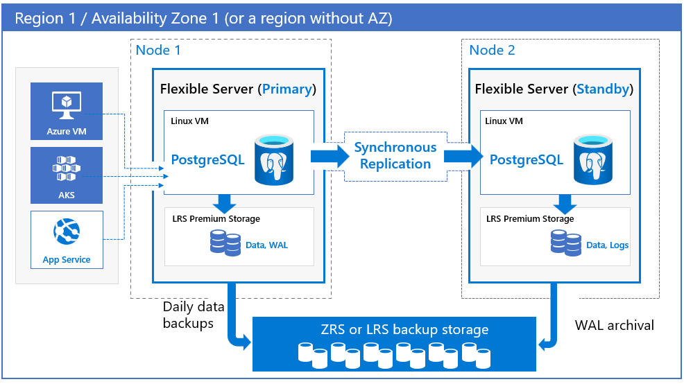 Azure Database for PostgreSQL unterstützt hohe Verfügbarkeit, indem physisch getrennte primäre und Standby-Replikate bereitgestellt werden, entweder innerhalb derselben Verfügbarkeitszone (Zonal) oder über Verfügbarkeitszonen (zonenredundant). Dieses Modell für hohe Verfügbarkeit ist so konzipiert, dass zugesicherte Daten bei Fehlern nie verloren gehen. Bei einem Setup mit Hochverfügbarkeit (High Availability, HA) werden Daten synchron sowohl auf dem Primärserver als auch auf den Standbyservern committet. Das Modell ist so konzipiert, dass die Datenbank nicht zu einem Single Point of Failure in Ihrer Softwarearchitektur wird. Weitere Informationen zur Hochverfügbarkeit und zur Unterstützung von Verfügbarkeitszonen finden Sie unter Unterstützung von Verfügbarkeitszonen.