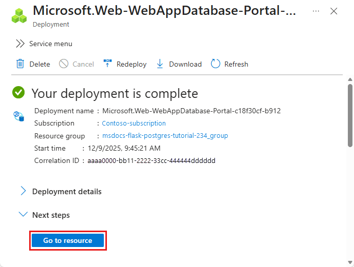 - Wählen Sie in der Ressourcengruppemsdocs-python-postgres-tutorial aus.