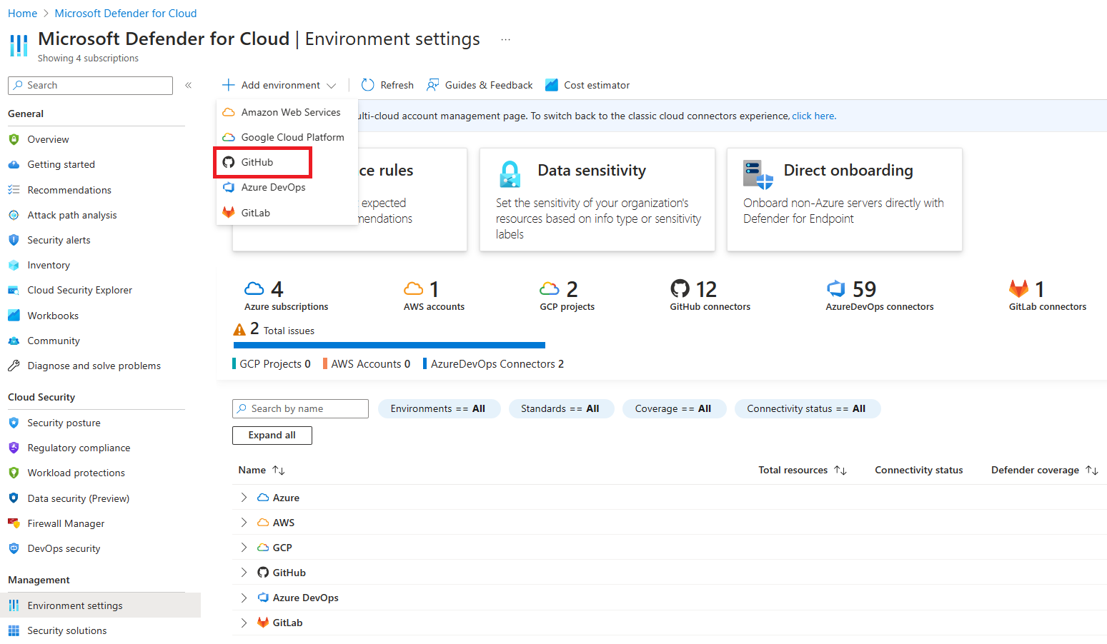 In diesem Schnellstart verbinden Sie Ihre GitHub-Organisationen auf der Seite Umgebungseinstellungen in Microsoft Defender for Cloud. Diese Seite bietet eine einfache Onboardingerfahrung zur automatischen Ermittlung Ihrer GitHub-Repositorys.