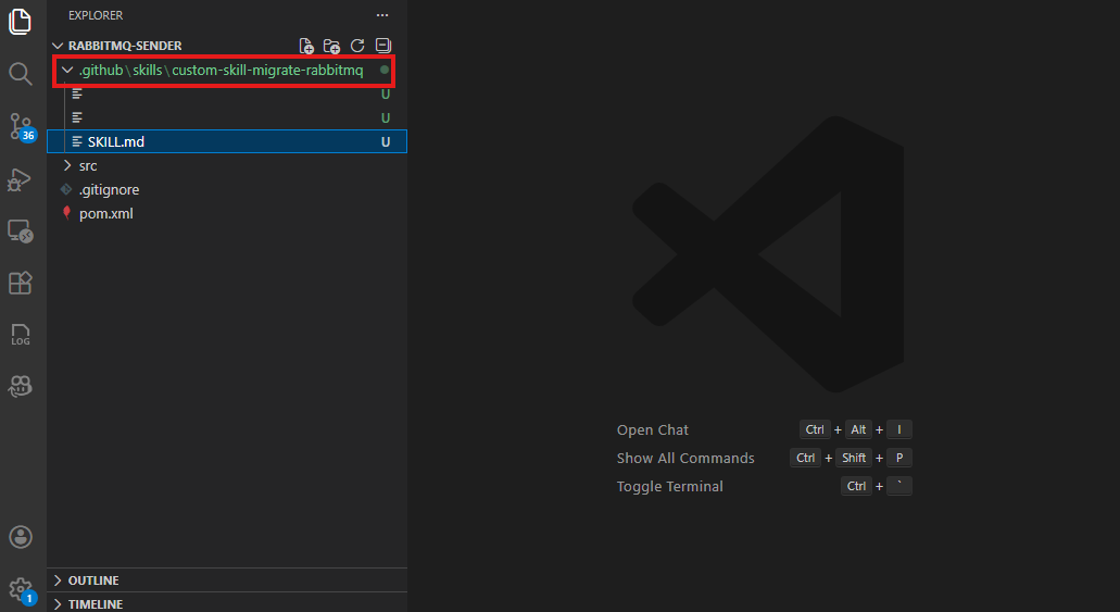 Wenn Sie zuvor benutzerdefinierte Vorgänge verwendet haben , die in .github/appmod/custom-tasks/ den Projekt- oder Visual Studio Code-Benutzerdaten gespeichert sind, migriert die Erweiterung diese automatisch an den neuen .github/skills/ Speicherort des Projekts beim ersten Laden.