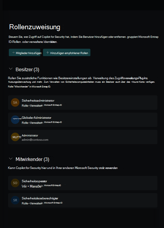 Es wird empfohlen, Sicherheitsgruppen zu verwenden, um Security Copilot Rollen anstelle einzelner Benutzer zuzuweisen. Dies reduziert die administrative Komplexität.