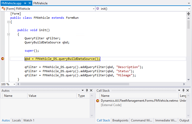 To debug X++ code, you use the debugger in Microsoft Visual Studio. The process is similar to the process that is used for any other application that is created in Visual Studio. For example, the standard tools for examining the application are available when your code is stopped at a breakpoint.