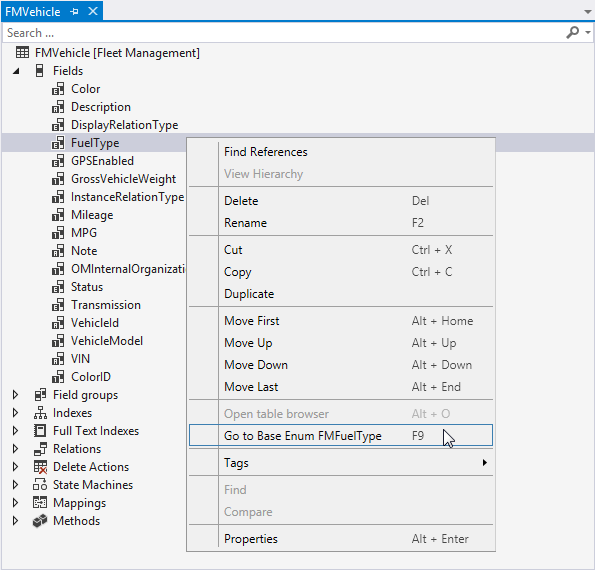 The value of a node in the element designer is often a reference to another element. For example, a field node in a table element is typically based on an extended data type (EDT) element. When you right-click a node in the element designer, you can click the Go to <element> command to navigate to that related element. For example, when you right-click the FuelType node in the list of fields for the FMVehicle table, you can click Go to Base Enum FMFuelType to show the base enumeration that is used to define the field.
