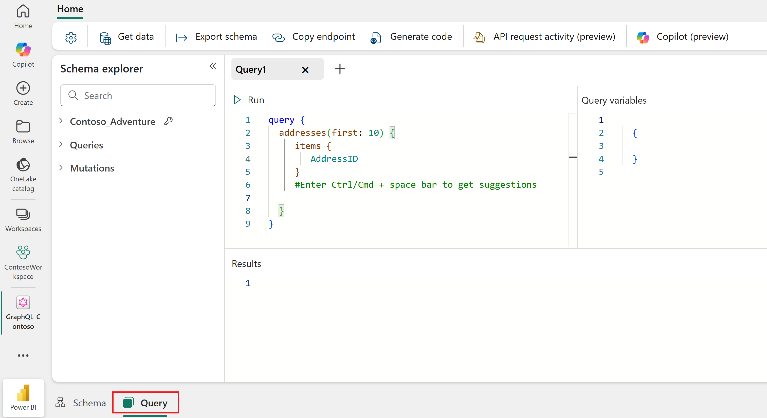 query { addresses(first: 5) { items { AddressID City StateProvince CountryRegion } } }Führen Sie die Abfrage aus: Wählen Sie "Ausführen" aus, um die Abfrage auszuführen, und überprüfen Sie, ob sie im Editor ordnungsgemäß funktioniert, bevor Sie fortfahren.