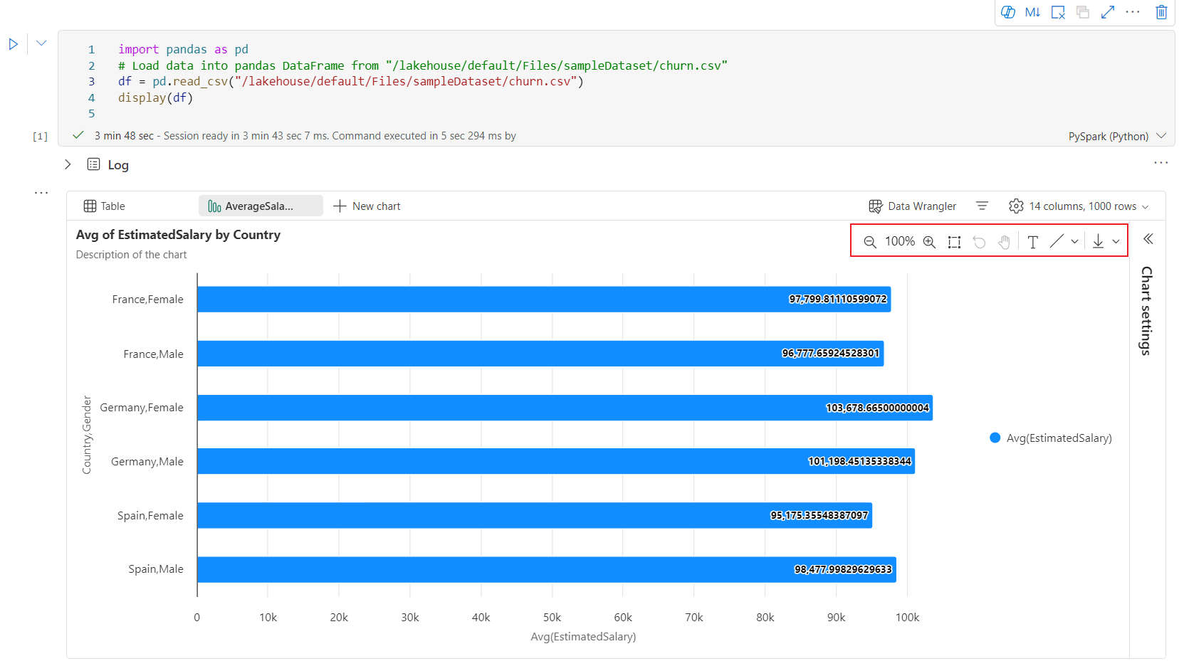 Fabric-Notizbücher ermöglichen es Ihnen auch, tabellarische Ergebnisse in benutzerdefinierte Diagramme zu konvertieren, ohne Code zu schreiben, wodurch eine intuitivere und nahtlose Datenerkundung ermöglicht wird.