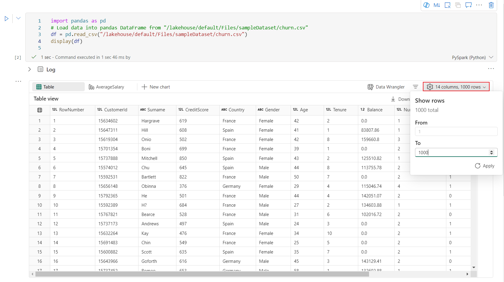Standardmäßig wird die Tabellenansicht bei Verwendung des Befehls "display()" in einem Fabric-Notizbuch gerendert. Die rich dataframe Preview bietet eine intuitive freie Auswahlfunktion, die die Datenanalyseerfahrung verbessern soll, indem flexible, interaktive Auswahloptionen ermöglicht werden. Mit diesem Feature können Benutzer datenframes effizient navigieren und mühelos erkunden.