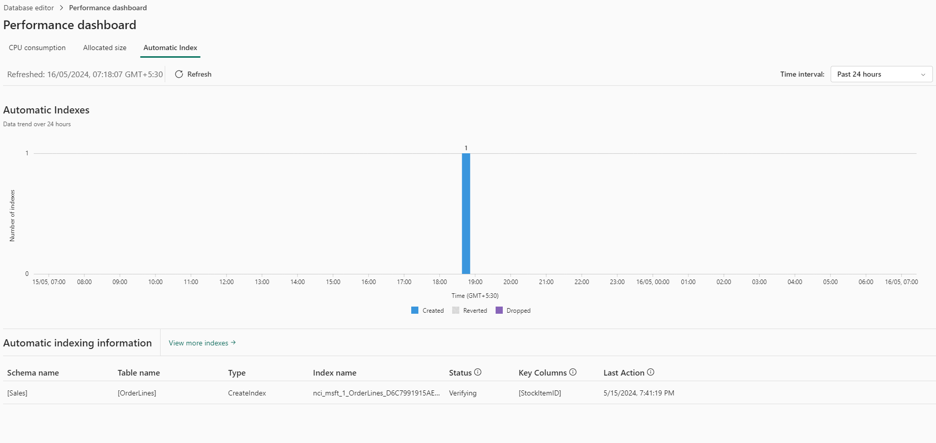 Die Registerkarte mit dem Bericht „Automatischer Index“ zeigt einen Verlauf und den Status der automatisch erstellten Indizes an.