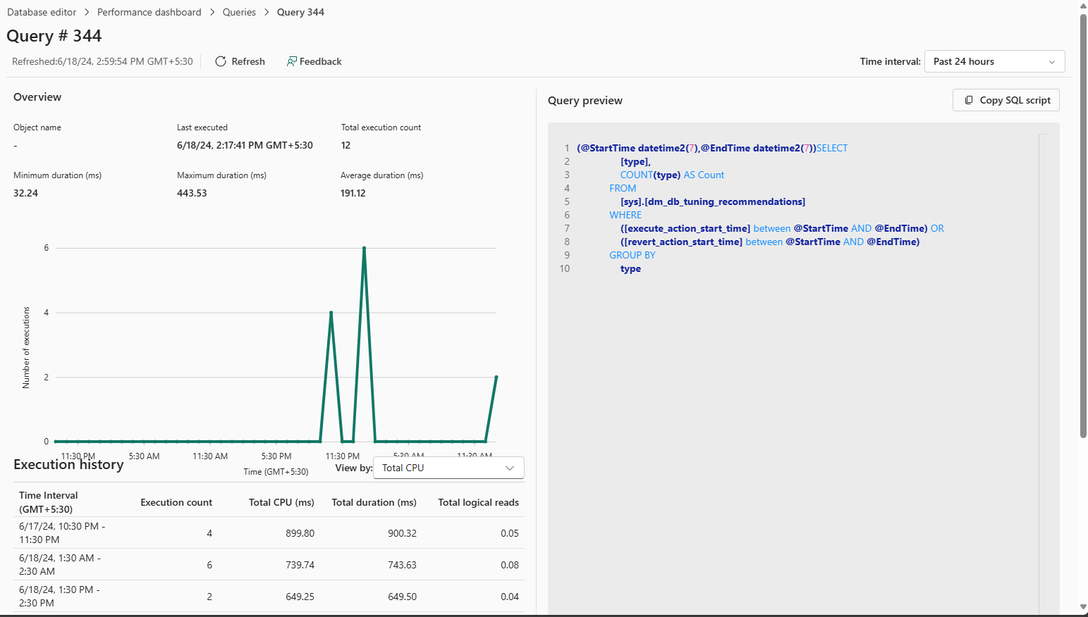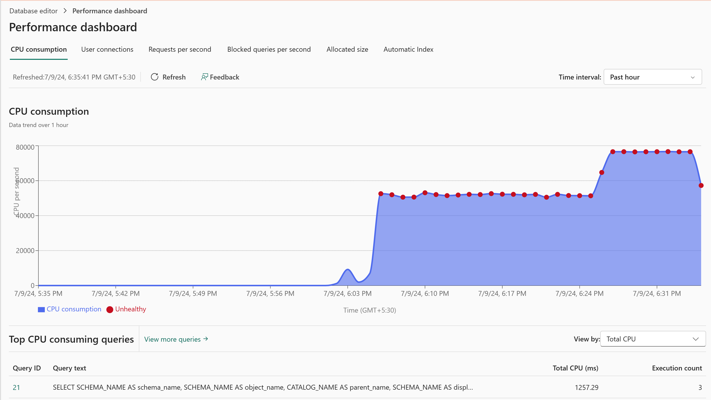 - Eine sortierbare Liste der Abfragen mit der höchsten CPU-Auslastung, zunächst absteigend sortiert nach Gesamt-CPU (ms).