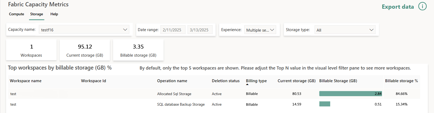 Die Berichterstellung zur Speicherauslastung erfolgt auf Arbeitsbereichsebene. Weitere Informationen zur Speichernutzung in der Datenbank finden Sie unter Performance Dashboard für SQL-Datenbank in Microsoft Fabric.