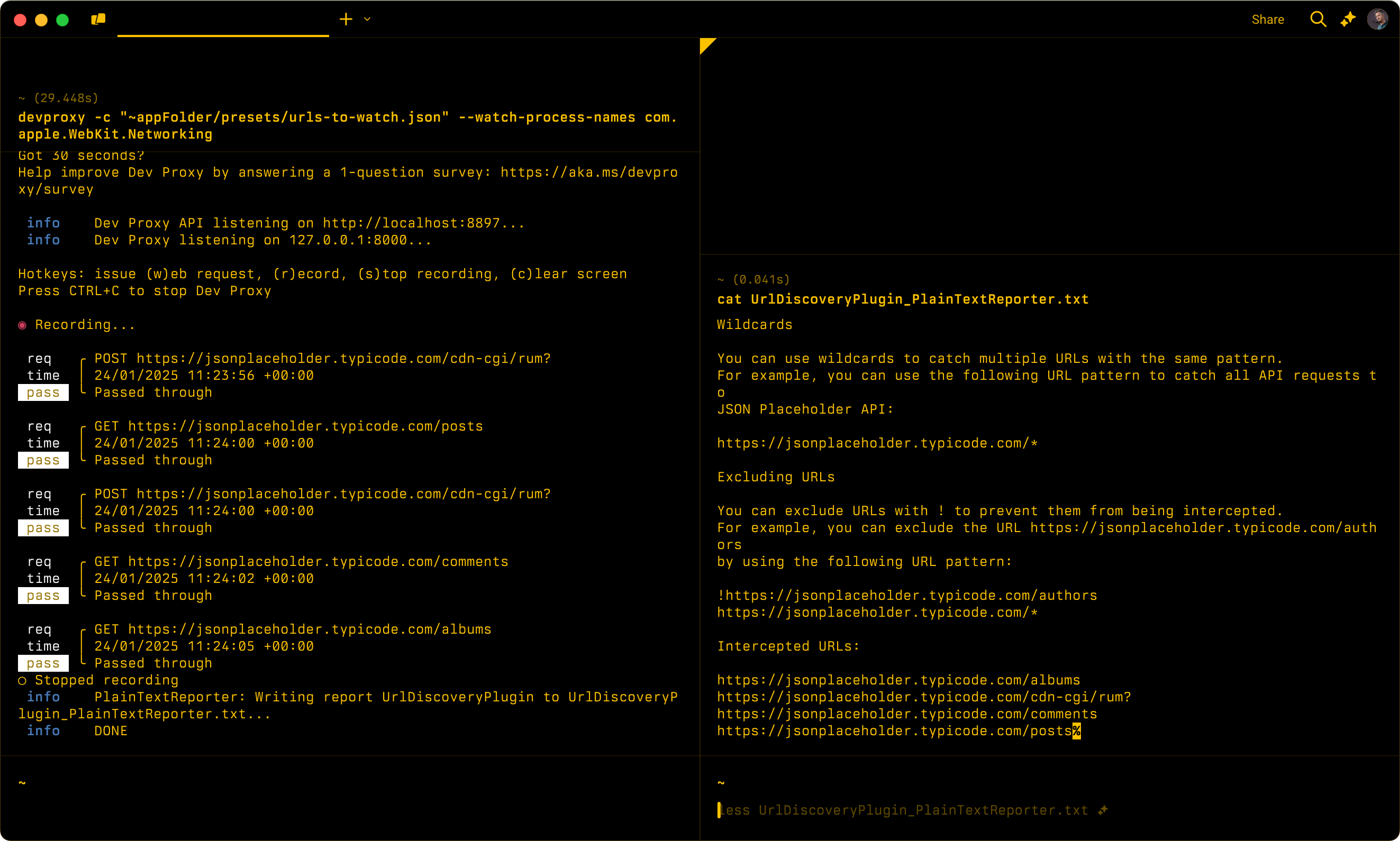 Erstellt eine Liste von URLs, die von Dev Proxy abgefangen wurden. Verwenden Sie dieses Plug-In, um zu erfahren, welche URLs Ihre App aufruft, und wie Sie den Dev-Proxy so konfigurieren, dass verhaltensweisen für sie simuliert werden.
