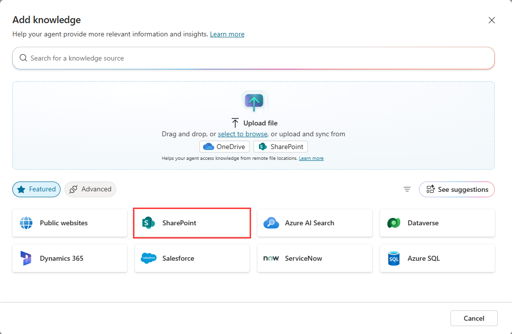 SharePoint als Wissensquelle funktioniert, indem Sie Ihren Agent mit einer SharePoint URL oder SharePoint Listen koppeln. In diesem Artikel werden die vollständigen SharePoint Integrationsfunktionen behandelt, die durch Auswählen des Dialogfelds SharePoint im Dialogfeld Add knowledge bereitgestellt werden.