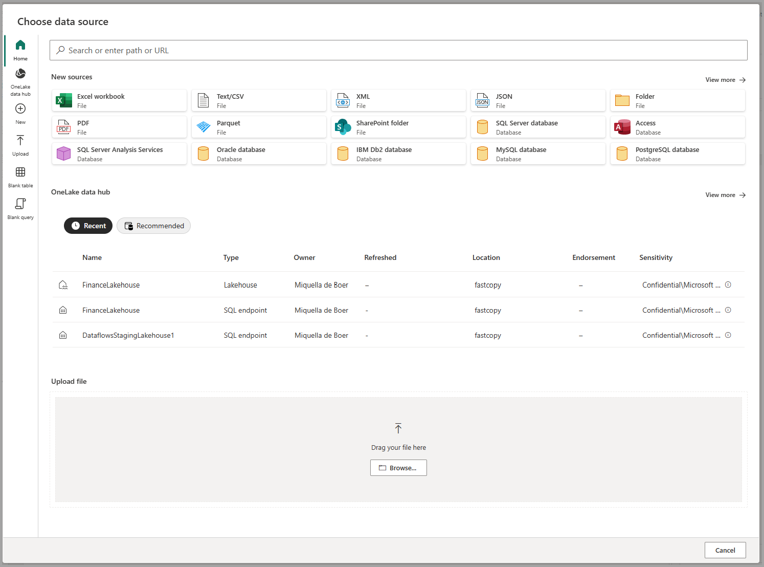 Wenn Sie die Option "Neue Quelle " verwenden, können Sie eine neue Tabelle definieren und eine Verbindung mit einer neuen Datenquelle herstellen.