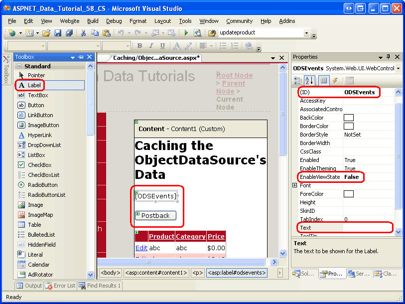 To fully appreciate the frequency with which the data is retrieved from the database, let s display a message indicating when the data is being re-retrieved. Add a Label Web control above the GridView named ODSEvents. Clear out its Text property and set its EnableViewState property to False. Underneath the Label, add a Button Web control and set its Text property to Postback .