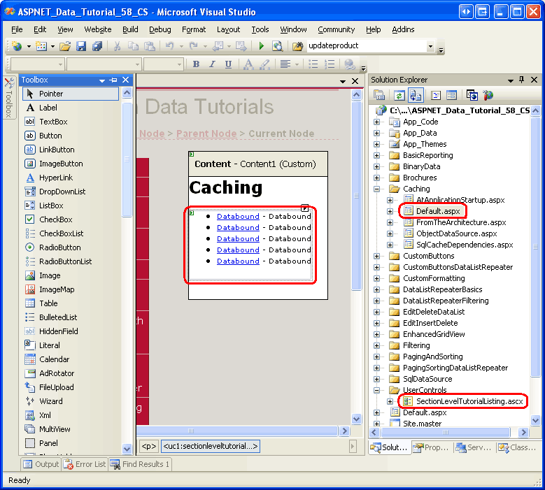 Like in the other folders, Default.aspx in the Caching folder will list the tutorials in its section. Recall that the SectionLevelTutorialListing.ascx User Control provides this functionality. Therefore, add this User Control to Default.aspx by dragging it from the Solution Explorer onto the page s Design view.