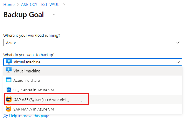 On the Backup Goal, select SAP ASE (Sybase) in Azure VM as the datasource type.
