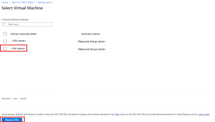 On the Select Virtual Machines pane, download the prepost script that provides permissions for the Azure Backup service to access the SAP ASE VMs for database discovery.