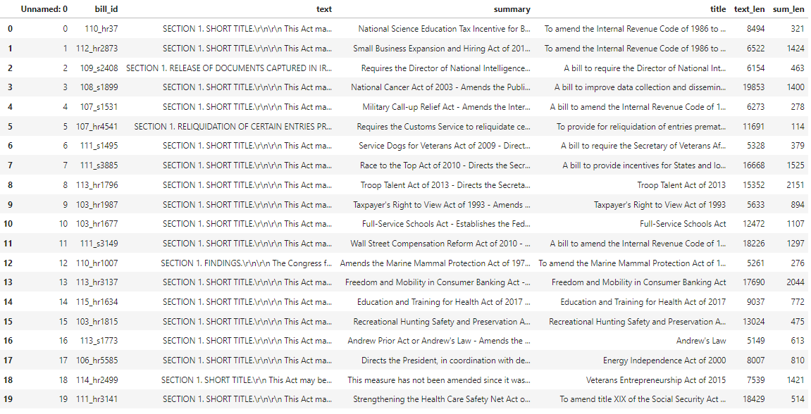 The initial table has more columns than we need we'll create a new smaller DataFrame called df_bills which will contain only the columns for text, summary, and title.