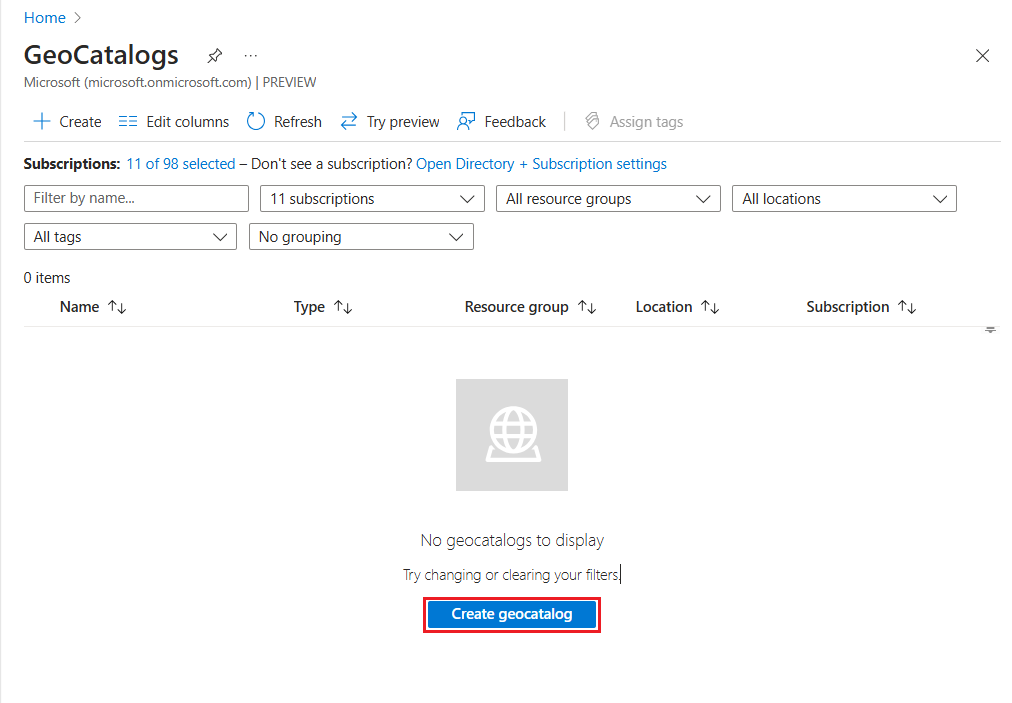 Start the GeoCatalog creation process by either 1) selecting the Create button at the top left of the screen, or 2) selecting the Create geo catalog button in the lower center of the screen. The Create geocatalog button doesn't appear if you have one or more existing GeoCatalogs.
