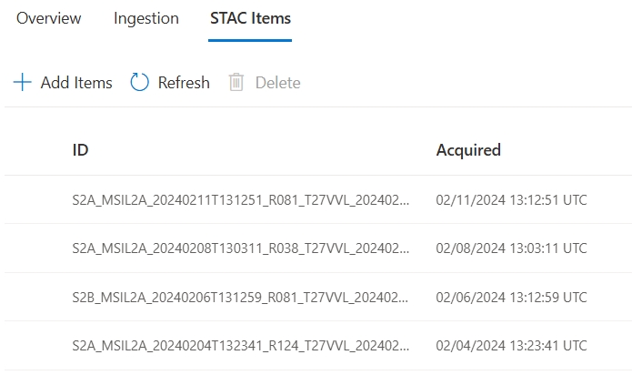 When the ingestion run is complete, the STAC items tab in your collection displays your list of STAC items that have been ingested, with columns for the item ID and acquisition date.