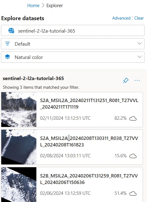 - After querying and filtering the collection items to your desired results, select the pin icon to the right of the dataset name in the Explore Datasets side-panel.