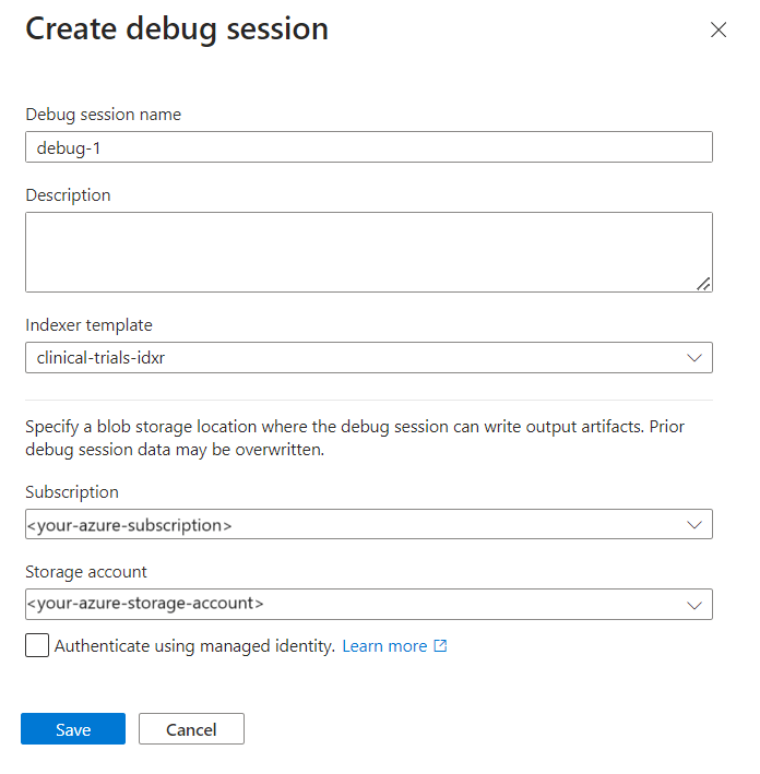debug-sessions.restfile.Provide the following variables: search service URL, search services admin API key, storage connection string, and the name of the blob container storing the PDFs.