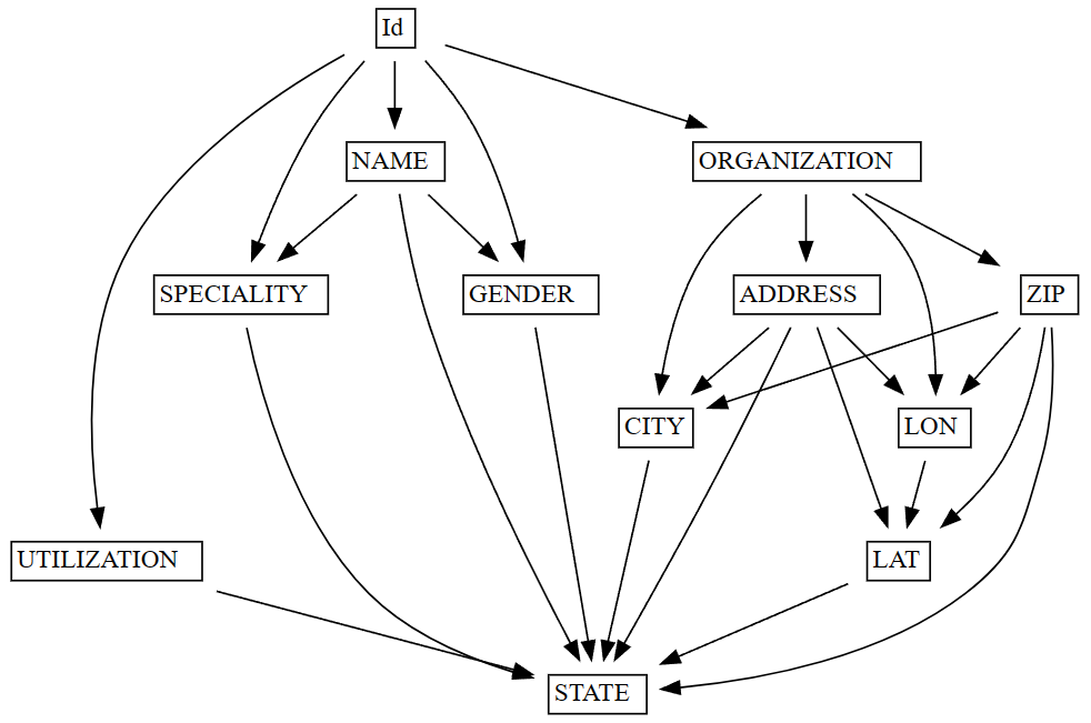 In this example, the function assumes an existing functional dependency between the ZIP (determinant) and CITY (dependent) columns. If the dataset has data quality problems - for example, the same ZIP code assigned to multiple cities - the function generates a graph of the violating values.