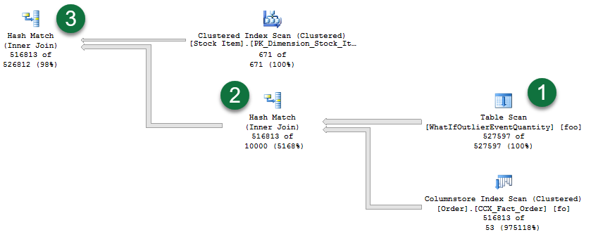 - The MSTVF Table Scan has a fixed estimate of 100 rows. For this example, however, there are 527,597 rows flowing through this MSTVF Table Scan, as seen in Live Query Statistics via the 527597 of 100 actual of estimated - so the fixed estimate is significantly skewed.