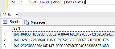 Screenshot of the SELECT [SSN] FROM [dbo].[Patients] query and the results of the query shown as binary ciphertext values.