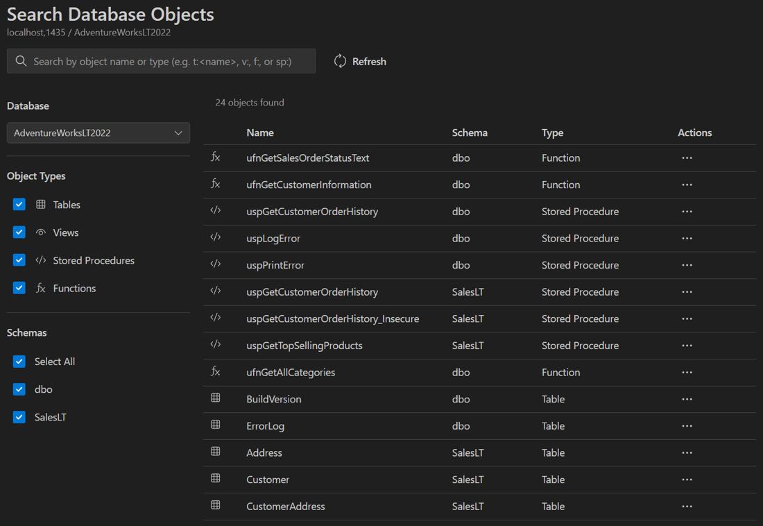 The Database Object Search feature lets you quickly find tables, views, functions, and stored procedures across your databases. You can search by name, filter by object type or schema, and run common actions directly from the results list.