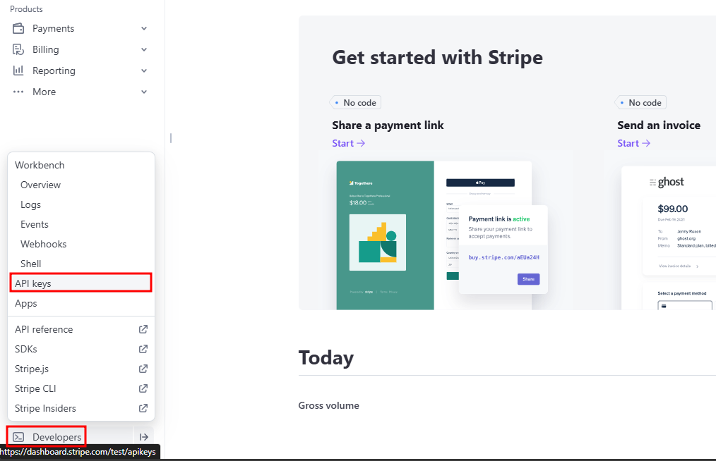 To find your API keys from the Home page, go to Developers > API keys in the left navigation menu.