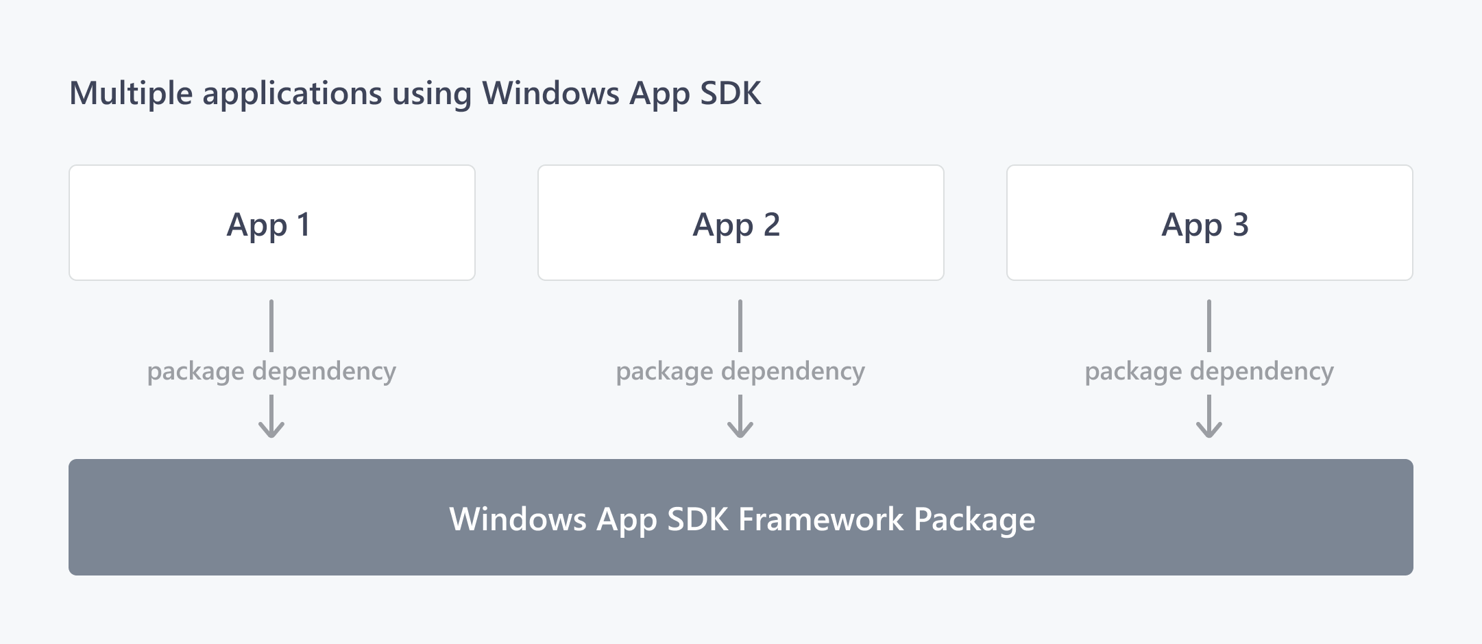 The Windows App SDK framework package is an MSIX package that is deployed to end users through the Microsoft Store. It can be easily and quickly updated with servicing releases, which may include security and reliability fixes. All framework-dependent apps that use the Windows App SDK have a dependency on a shared instance of the framework package, as illustrated in the following diagram.