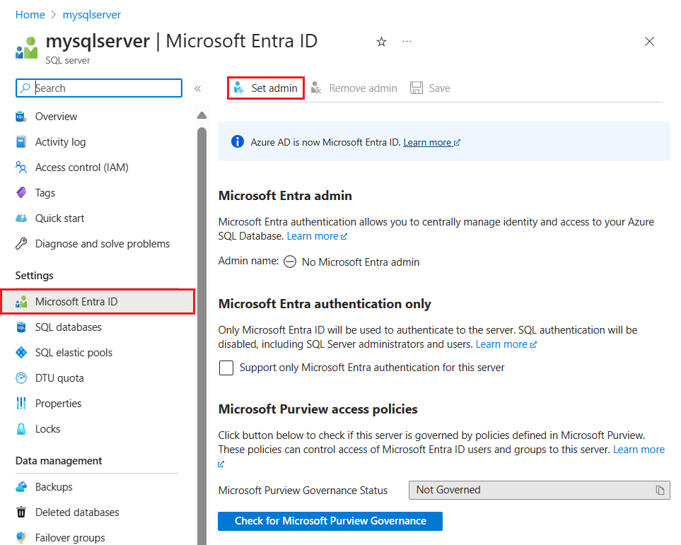 En Azure Portal, en la página SQL Server, seleccione Microsoft Entra ID en el menú de recursos y después Establecer administrador para abrir el panel Microsoft Entra ID.