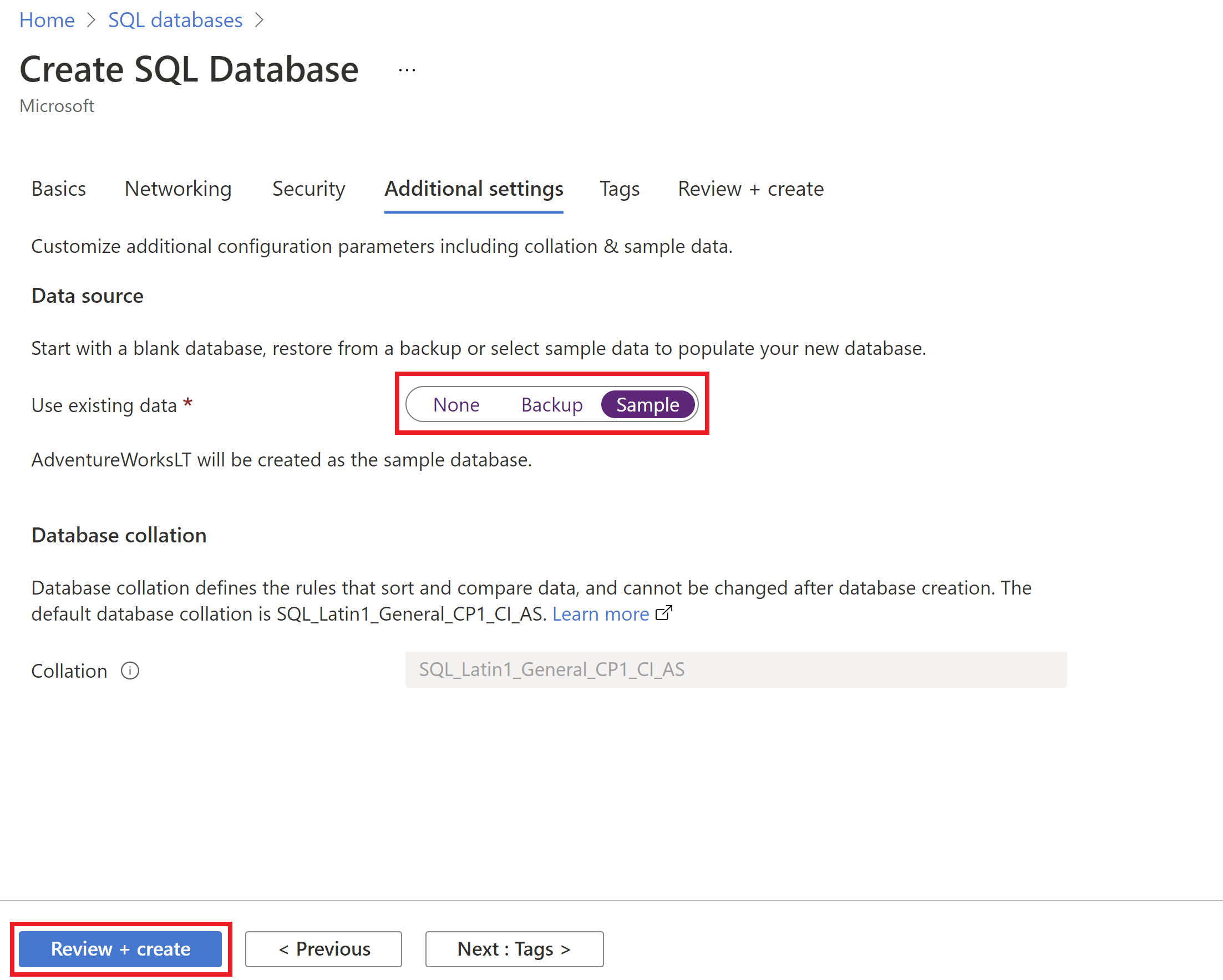 AdventureWorksLT, por lo que hay algunas tablas y datos que se pueden consultar y con los que experimentar, en lugar de una base de datos vacía. También puede configurar la intercalación de base de datos y una ventana de mantenimiento.Selecciona Revisar + crear.