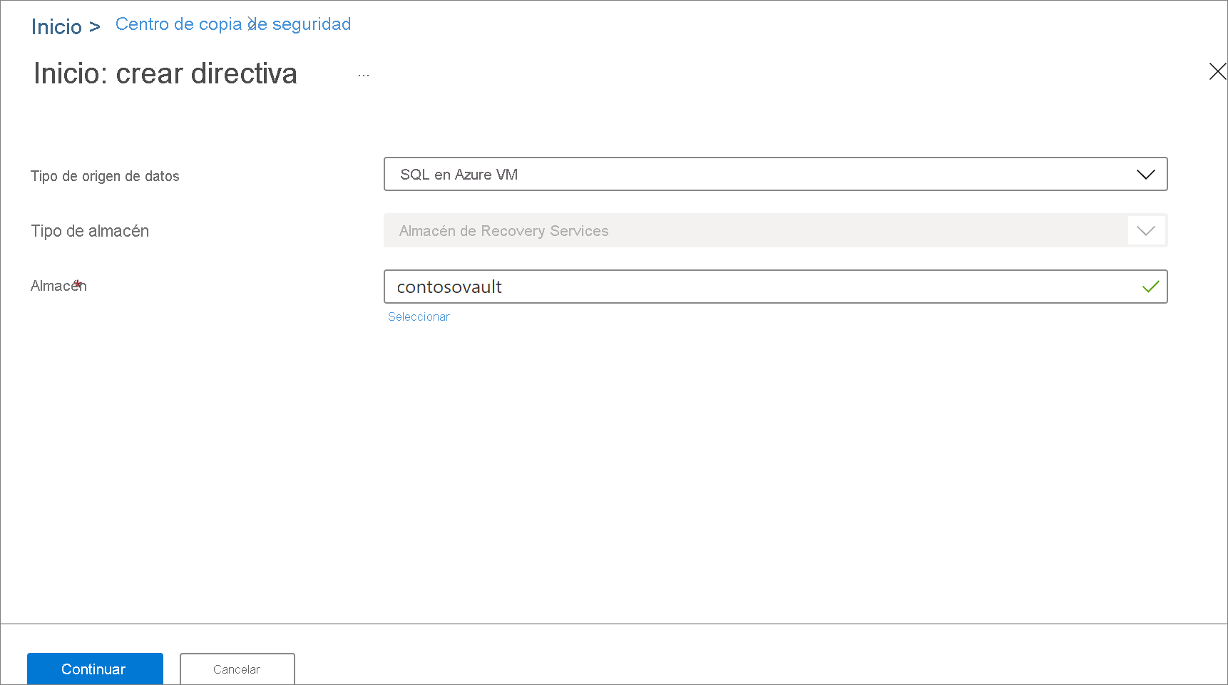 En el panel Inicio: Crear directiva , seleccione SQL Server en la máquina virtual de Azure como tipo de origen de datos, seleccione el almacén en el que se debe crear la directiva y, a continuación, seleccione Continuar.