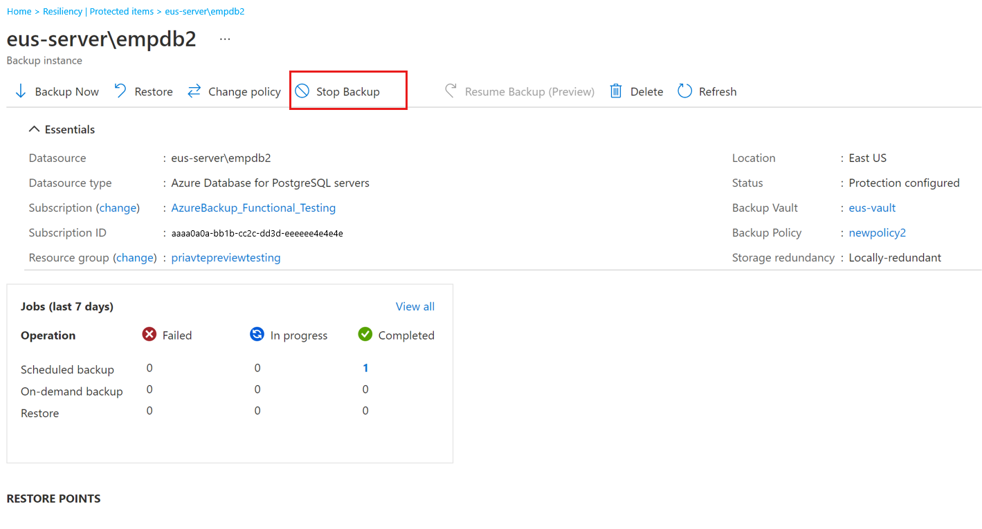 Detener la copia de seguridad y eliminar datos: esta opción le ayuda a detener todos los trabajos de copia de seguridad futuros para el servidor de Azure Database for PostgreSQL y eliminar todos los puntos de recuperación. No puede restaurar la base de datos ni usar la opción Reanudar copia de seguridad .