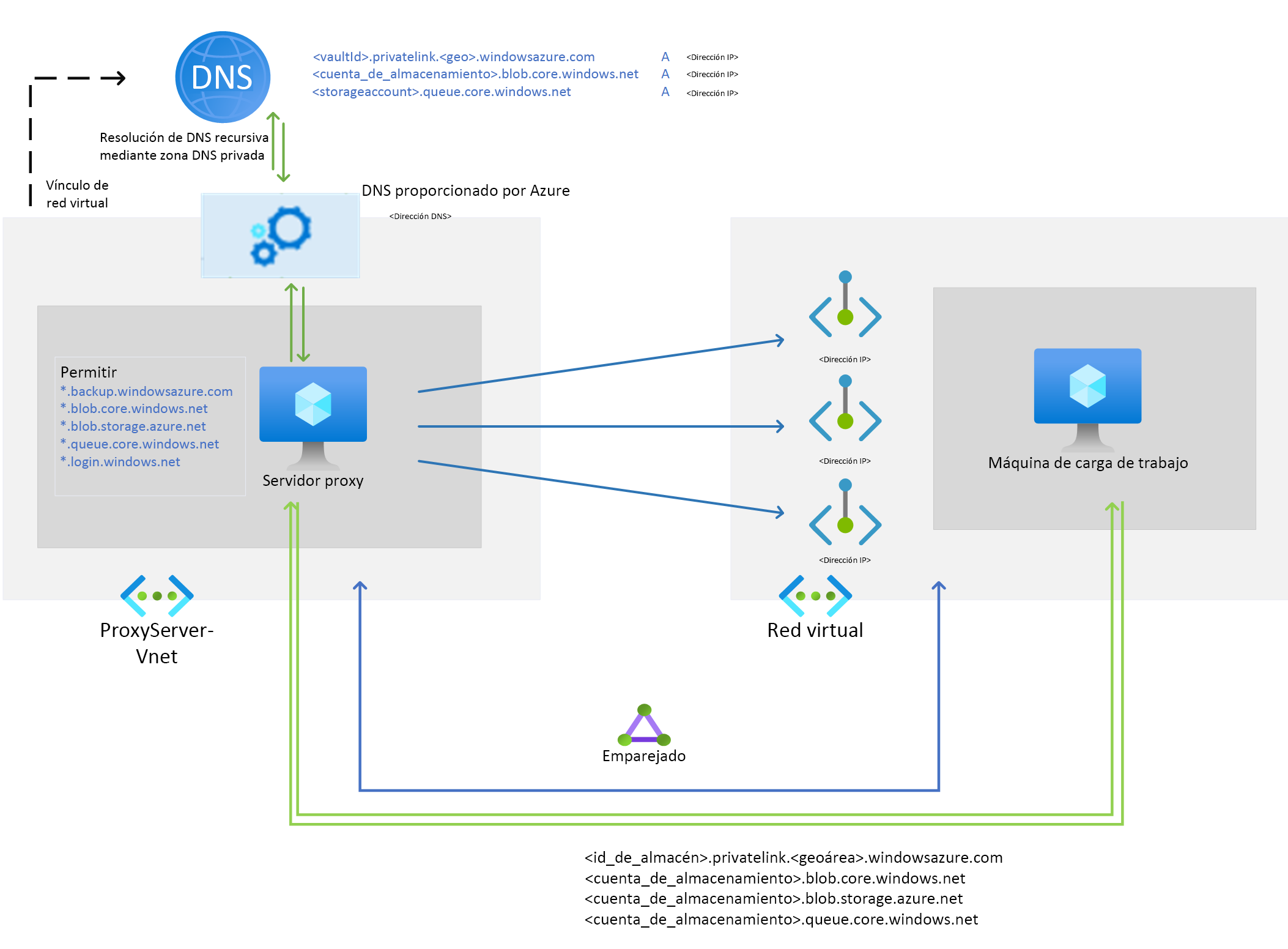 *.privatelink.<geo>.backup.windowsazure.com,*.privatelink.blob.core.windows.net,*.privatelink.queue.core.windows.net) con la red virtual donde se crea el servidor proxy o use un servidor DNS personalizado con las entradas DNS correspondientes.