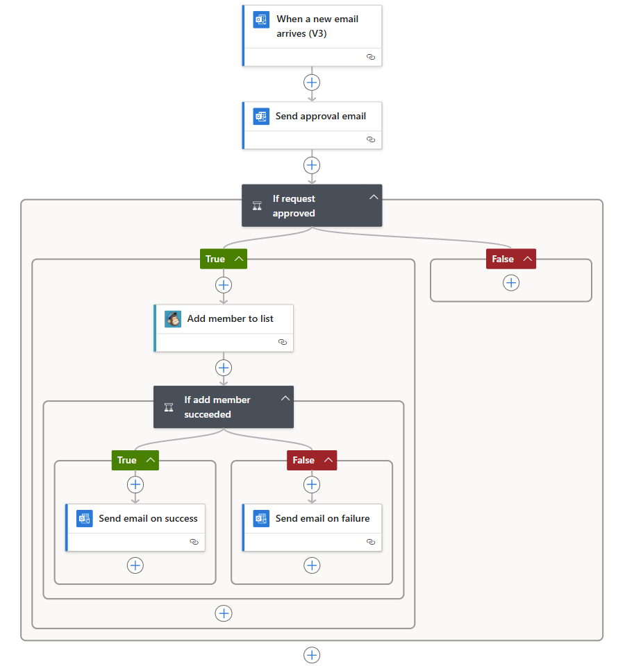 En los pasos siguientes, se agrega una acción para enviar un correo electrónico correcto cuando el flujo de trabajo agrega correctamente al miembro a la lista de distribución de correo.
