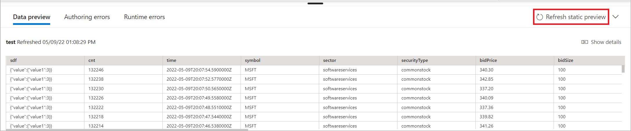 - Ejemplo dinámico de datos entrantes en la tabla de Vista previa de los datos en la vista de diagrama. Se actualiza automáticamente de manera periódica. Puede seleccionar Pause streaming preview (Pausar vista previa de streaming) para ver una vista estática de los datos de entrada de ejemplo.