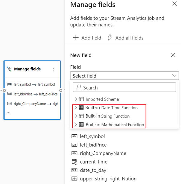 También puede agregar un nuevo campo con las Funciones integradas para agregar los datos del flujo ascendente. Actualmente, las funciones integradas que se admiten son algunas funciones en Funciones de cadena, Funciones de fecha y hora, Funciones matemáticas. Para más información sobre las definiciones de estas funciones, consulte Funciones integradas (Azure Stream Analytics).