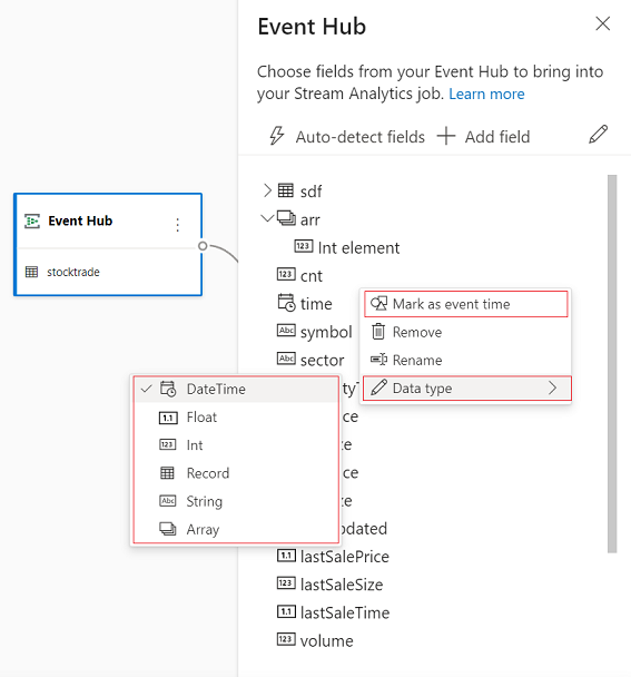 Puede editar los nombres de los campos, eliminar campos, cambiar el tipo de datos o cambiar la hora del evento (Marcar como hora del evento: cláusula TIMESTAMP BY si es un campo de tipo datetime), seleccionando el símbolo de tres puntos junto a cada campo. También puede expandir, seleccionar y editar los campos anidados de los mensajes entrantes, como se muestra en la imagen siguiente.