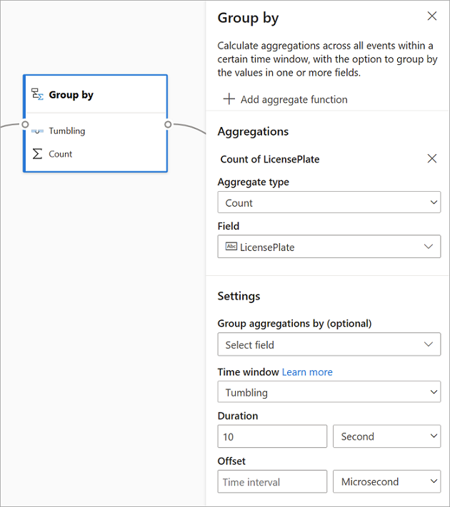 Para agregar una agregación, seleccione el símbolo Transformación. Después, conecte una entrada, seleccione la agregación, agregue cualquier dimensión de filtro o segmentación y seleccione el período de tiempo de cálculo de la agregación. En este ejemplo, se calcula la suma del valor del peaje según el estado del que procede el vehículo durante los últimos 10 segundos.