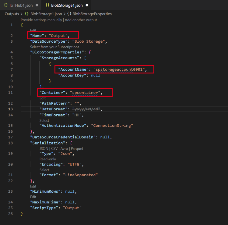 - En el editor JSON de Output.json, elija Seleccionar entre las suscripciones y, después, seleccione la suscripción de Azure que tenga la cuenta de Azure Storage.