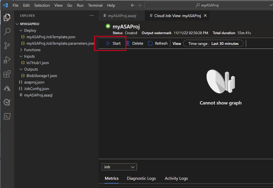 Visual Studio Code agrega un proyecto ASA a su espacio de trabajo. que consta de tres carpetas: Inputs, Outputs y Functions. También tiene el script de consulta (*.asaql) , un archivo JobConfig.json y un archivo de configuración asaproj.json.