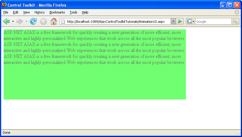 El control Animation del Kit de herramientas de control de ASP.NET AJAX no es solo un control, sino un marco completo para agregar animaciones a un control. La ejecución de la animación también se puede desencadenar mediante código JavaScript personalizado del lado cliente.