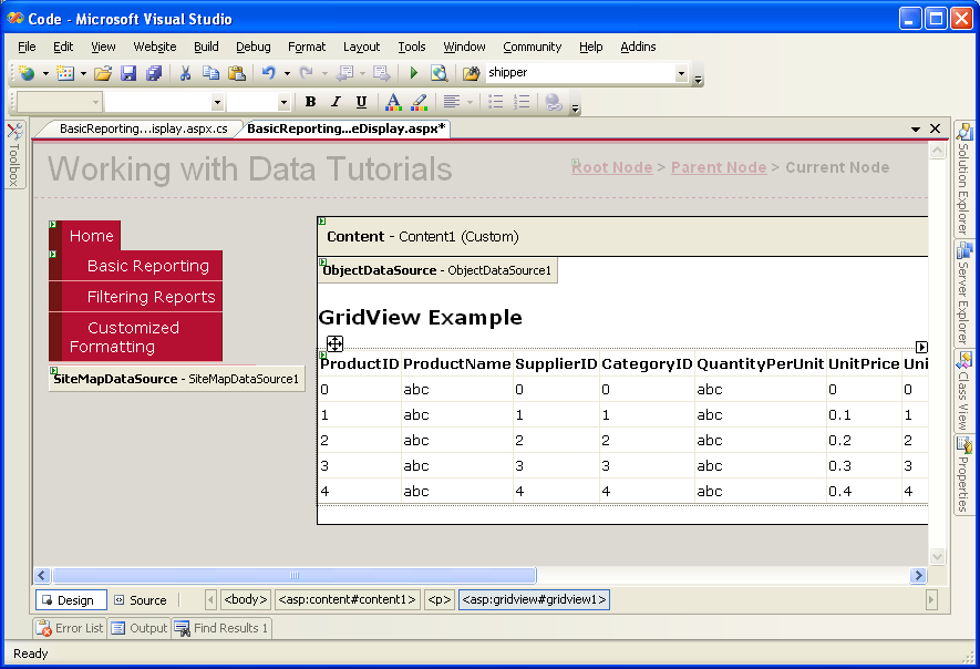 Para empezar, abra la SimpleDisplay.aspx página en la BasicReporting carpeta, cambie a la vista Diseño y, a continuación, arrastre un control ObjectDataSource desde el Cuadro de herramientas a la superficie de diseño de la página. ObjectDataSource aparece como un cuadro gris en la superficie de diseño porque no produce ningún marcado; simplemente accede a los datos invocando un método desde un objeto especificado. Los datos devueltos por un ObjectDataSource pueden mostrarse mediante un control web de datos, como GridView, DetailsView, FormView, etc.